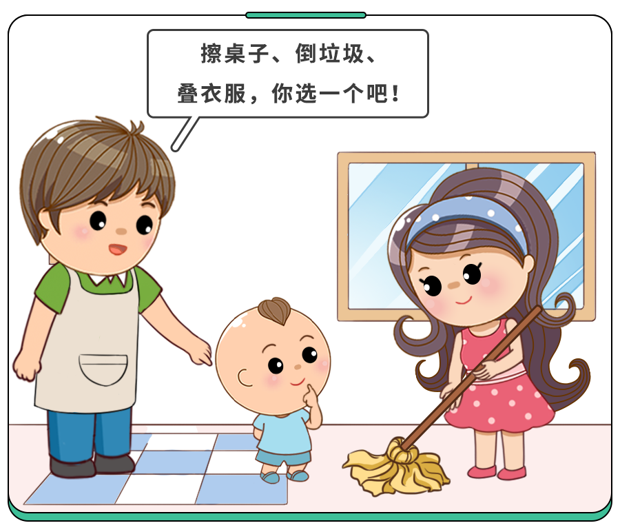 跟孩子一起做家务,给孩子几种选择,让他自己来选要做什么。