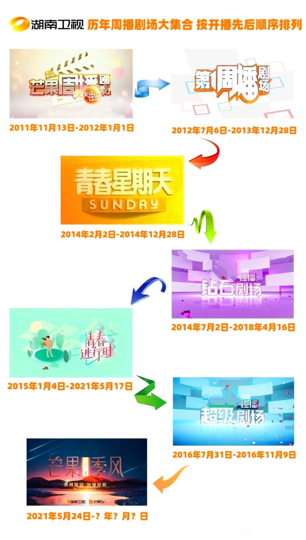 或许是意识到周播剧场实际上只是在用周播的方式播常规剧,有些名不副实。2014年芒果台重新推出《青春星期天》,每周只播一天,播出量身打造的周播剧,开篇剧集《爱的妇产科》质量相当不错,可谓是真正意义上的周播剧,但随后的单元剧《女王驾到》的播出效果就不太理想,后面几部剧集的都没有激起太多水花,有有走回老路的态势。
