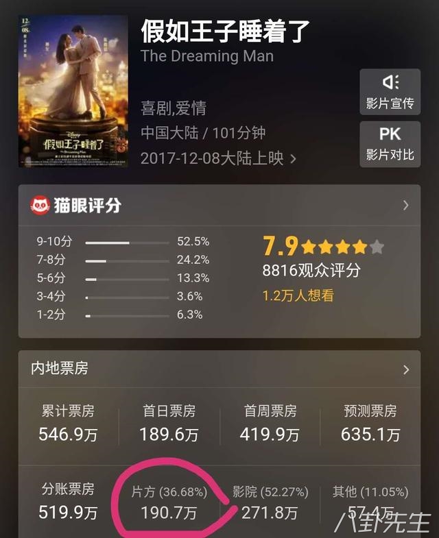 不过话说回来,《一吻定情》算是林允在《美人鱼》后票房表现最好的一部电影了,之前她还有一部更差的——跟陈柏霖合作的爱情电影《假如王子睡着了》,总票房546万。按这个数字,最后片方分到的钱只有190万,连两位主演的片酬都不够付,是一部实打实的亏本电影▼