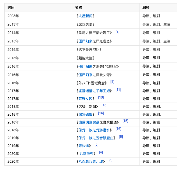 他的履历中,僵尸和盗墓题材的电影很多,但是名字都差不多,差异性不是很大。