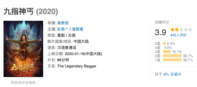 比如这一部网络大电影《九指神丐》,豆瓣评分只有3.9分,却以600万的成本狂收了1926万的分账票房,赚的是盆满钵满。