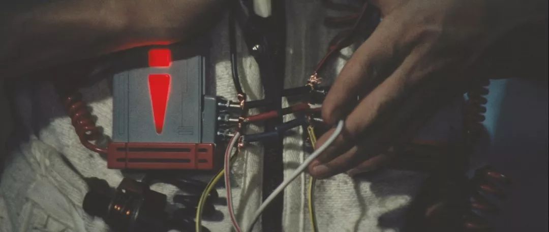 注意马甲腹部位置的三条主线,任何一条线断了都会引起爆炸,所以这件马甲一经启动就是脱不下来的。