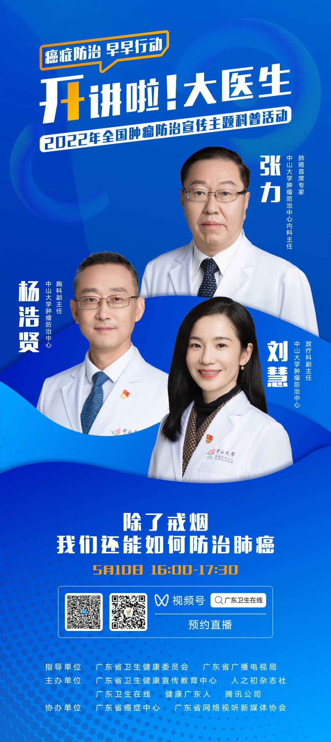 中山大学肿瘤防治中心内科主任、肺癌首席专家张力,胸科副主任杨浩贤,放射科副主任刘慧,联袂探讨《除了戒烟,我们还能如何防治肺癌》。