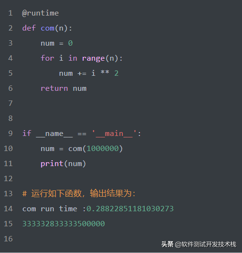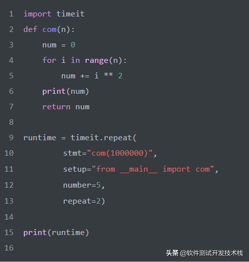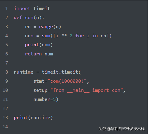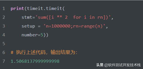 如果我们只是想计算 com函数里 sum([i 2 for i in rn]) 代码的运行时间,我们可以直接使用 timeit.timeit 方法,上述代码可以调整为: