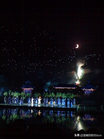 这时,灯光点亮,月儿弯,勾勒出整个骊山轮廓,颇为壮观。骊宫高处入青云,仙乐风飘处处闻。缓歌慢舞凝丝竹,尽日君王看足。
