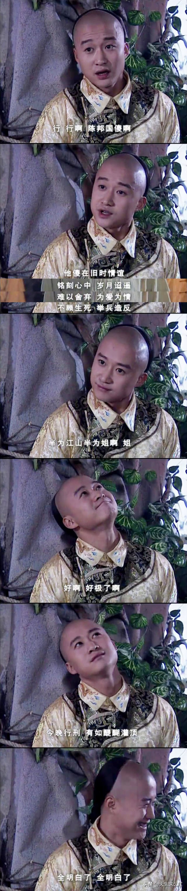 虽然陈邦国是个爱捣乱的小混蛋,但相比弘历我居然更喜欢他,尤其是,他虽然“落草为寇”,但是由于家学渊源还动不动就出口成章,简直反差萌。