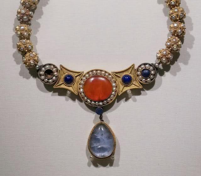 看到这些宝石首饰,不由得惊叹古代人民的审美情趣以及他们的智慧,古人在首饰材料的选择上经历了被动适应到主动开发的过程,从原始时代选择骨头石头作为材料开始直到后来金银和绿松石、蓝宝石等材料的选择上看出,任何美丽的东西都可以成为首饰的材料。从材料到珠宝造型,都充分反映了各个民族不同的思想意识着实令人称奇。