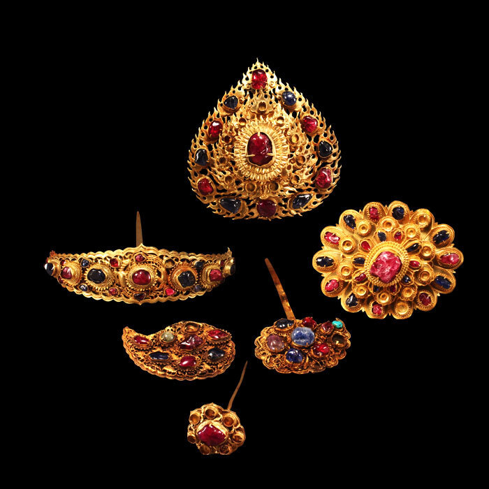 金头面是明代权贵人家妇女的常用首饰,因为明代流行的发式,人们会在鬏髻上插上停钗,这些停钗通常是一个主题的,由此组成一套完整的头饰组合,这一套头面共六件,每件均镶嵌红、蓝宝石,色彩斑斓,华丽异常。