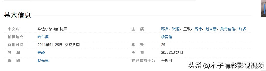 《马迭尔旅馆的枪声》是由广西电视台与黑龙江同利达影视投资有限公司联合出品,姜峰导演,邵兵、张恒、赵立新、吕行等主演的29集国际密战传奇剧。