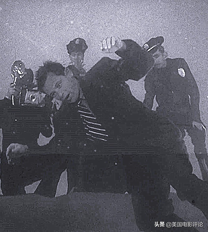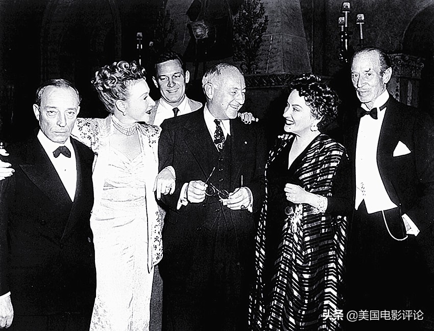 参加拍摄的多位默片知名演职人员合影,从左至右依次为巴斯特·基顿、安娜·尼尔森、威廉·霍尔登、塞西尔·b·戴米尔、葛洛丽亚·斯旺森和h.b.华纳