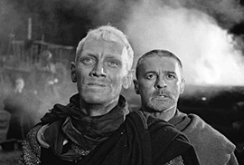 伯格曼的电影,永远在阴沉和无忧无虑,残酷和玩笑之间,做着细致的平衡和拿捏。所以,每次和死神的相遇,都充满了微妙的戏剧性,每次两位骑士之间的对话,都充满了戏谑和幽默。