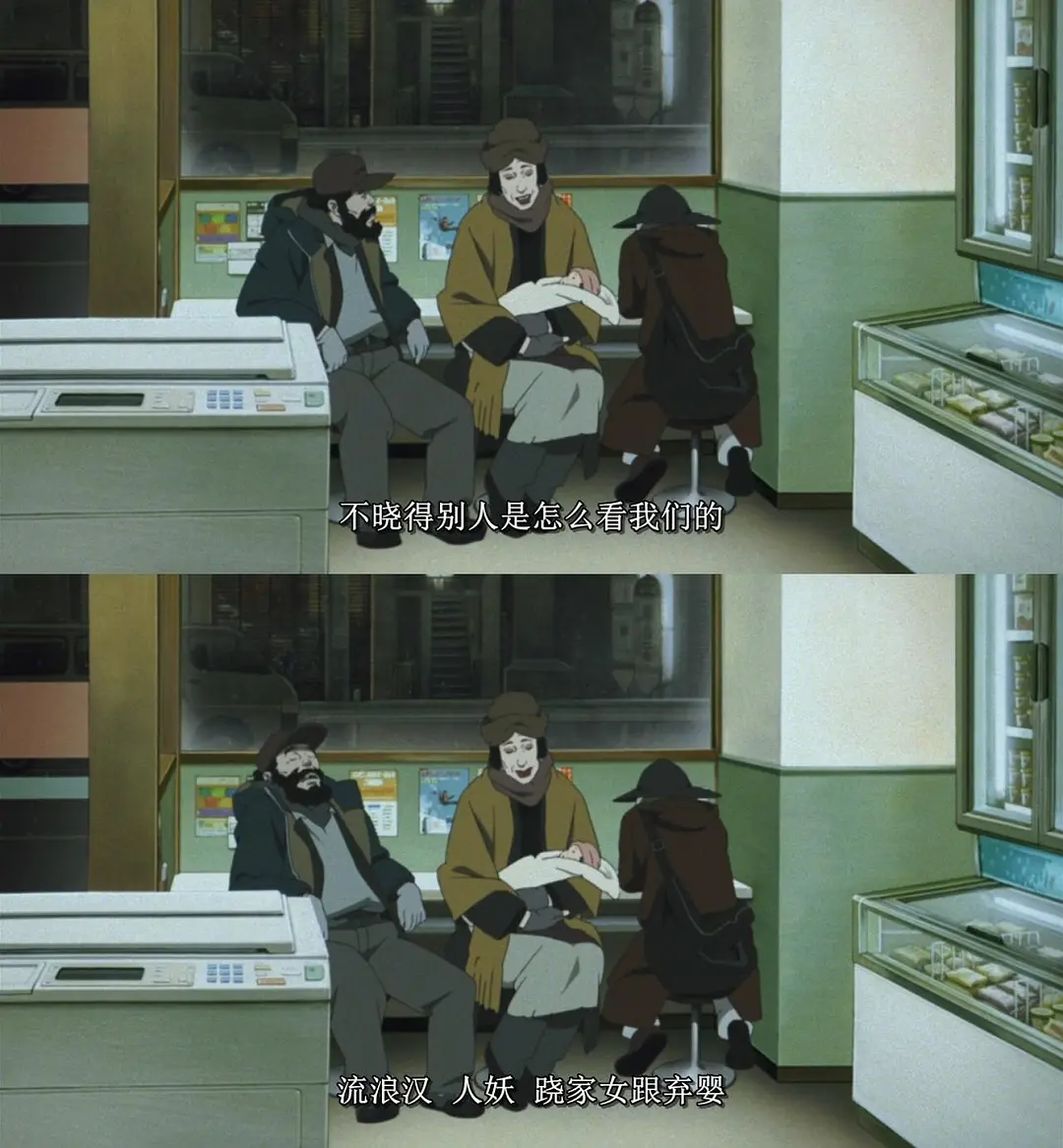金敏为了能够让这三个角色走进我们的内心,安排了太多不同的道路。可毕竟动画是2d世界,动画电影想要传达给观众的精神就会被或多或少的“过滤”掉一部分。可《东京教父》却奇迹般的完成了2d动画难以达到的两重境界:【感动】和【真实】。