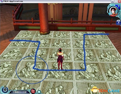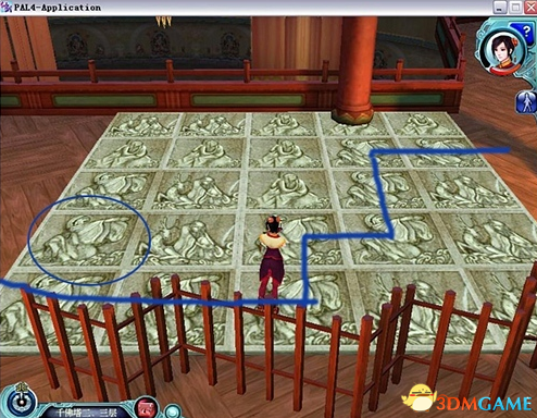 注意观察地面上的图案,第一个区域,踩到图案中和尚是伸着手的砖是正确。