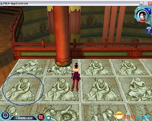 之后点燃2棵蜡烛,到五层。先点蜡烛,之后走第三个地面机关,这回有效砖面换了,换为拿拐棍的和尚了。