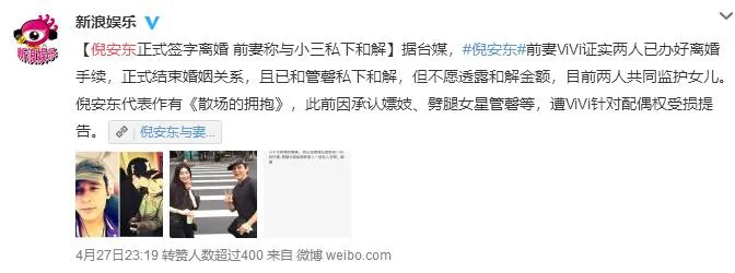 除了劈腿多人,倪安东还不知羞的大曝出轨细节,妻子vivi再也无法忍受,以“侵犯配偶权”起诉。