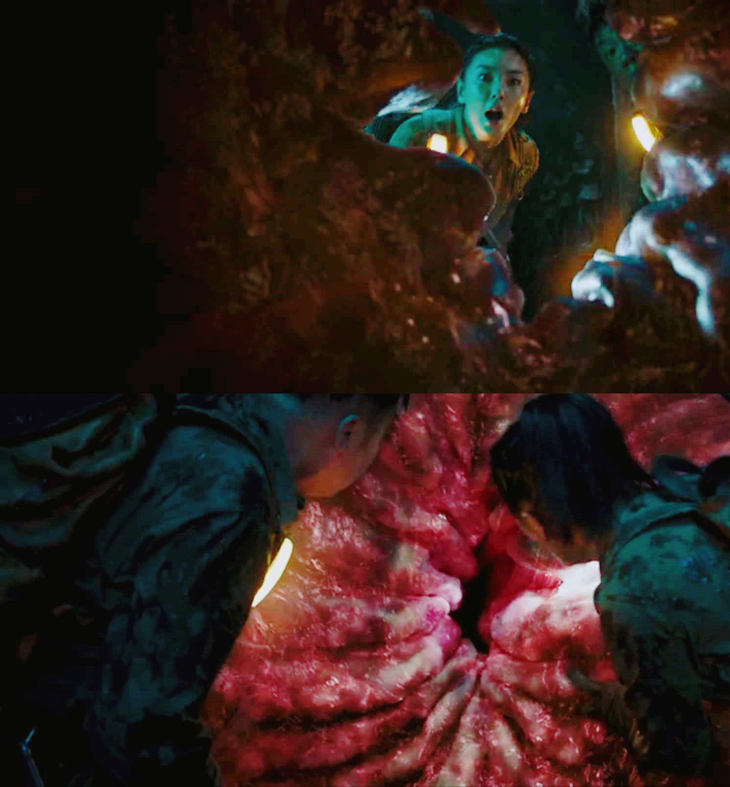 比如雮尘珠与献王脑袋融合到了一起的设定,剧版没拍;胡八一取出雮尘珠之后,献王余下躯体追击的部分,逃亡路上尸洞穷追不舍,见活物就吞的恐怖场景也没呈现出来;最可怕的尸洞一个手雷搞定了,肉灵芝直接给炸死了,对于原著党来说都不够看。