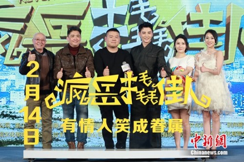 中新网北京2月13日电(记者 张曦)12日,喜剧电影《疯岳撬佳人》在北京举办首映发布会,导演钟少雄,岳云鹏、孙坚、石小满、古筝、郭若寒等主创悉数登场,郭德纲也以vcr的形式为电影加油助威,现场欢笑不断。