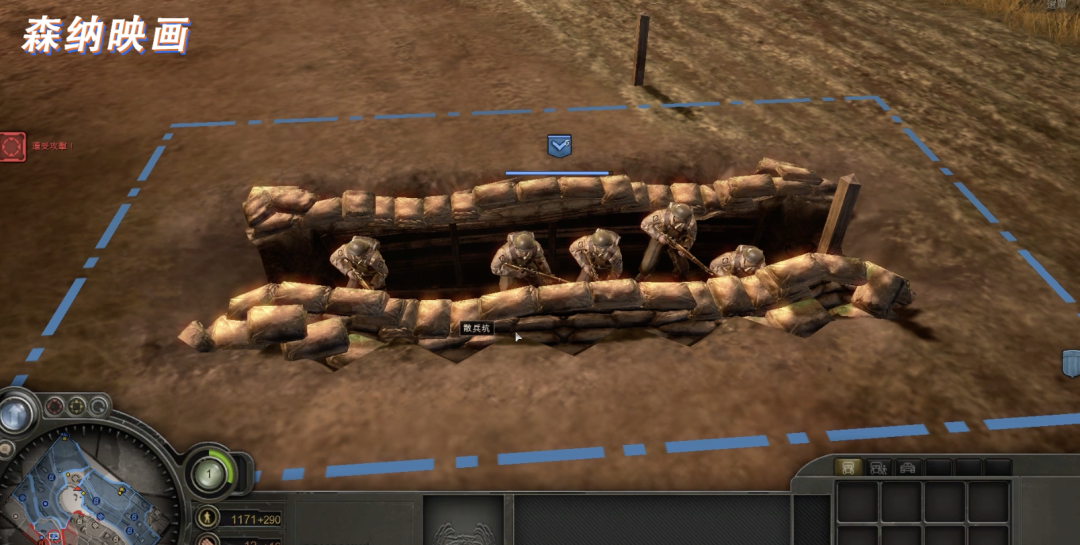 常规散兵坑讲完了,我们给大家看看游戏里出现的另一种,不太常见的散兵坑。那就是在《英雄连》中,英军部署的班组散兵坑。在游戏中的特点就是除开英军侦查小组,其余步兵单位均可以进行这种散兵坑的部署。这种班组散兵坑一次能够容纳一个班,被游戏设定为良好的掩体。往往两三个升级了反坦克抛射器的工兵班,能打的对面德军常规装甲单位痛不欲生,并且坦克想要攻击这些龟缩在散兵坑内的步兵还极为恼火。