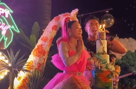 前几天,钟丽缇在个人社交平台上,晒出了她50岁生日的庆祝视频。在视频里,她和小她12岁的老公张伦硕,一起吹蜡烛。钟丽缇一身粉色连衣裙,婀娜多姿;张伦硕打扮成穿着裙装的野人,威猛豪放。整个庆祝现场,气氛相当浪漫、温馨。