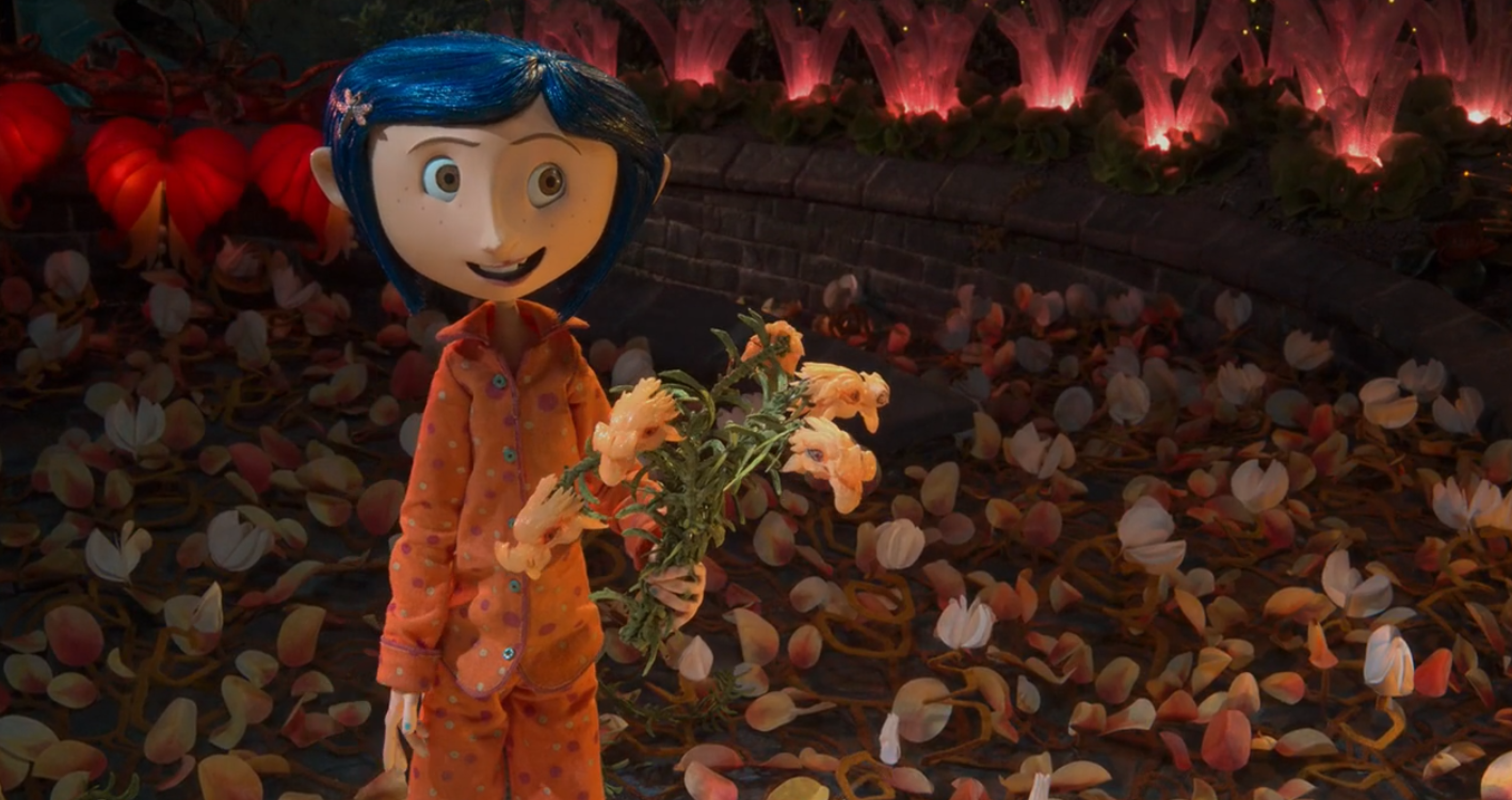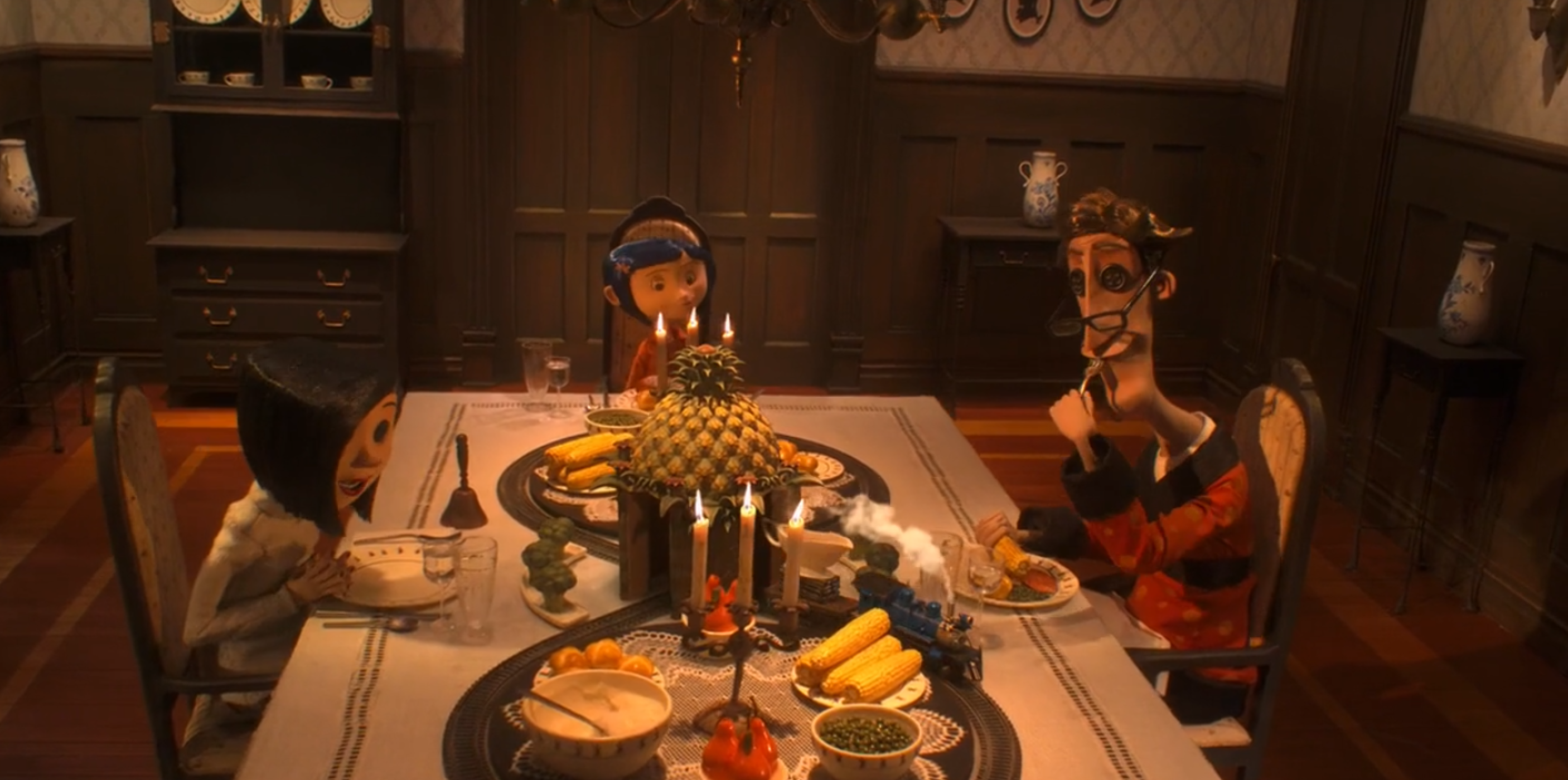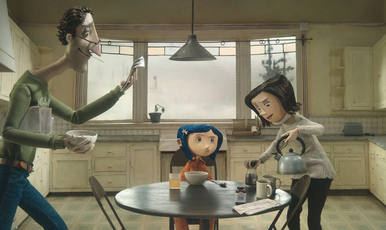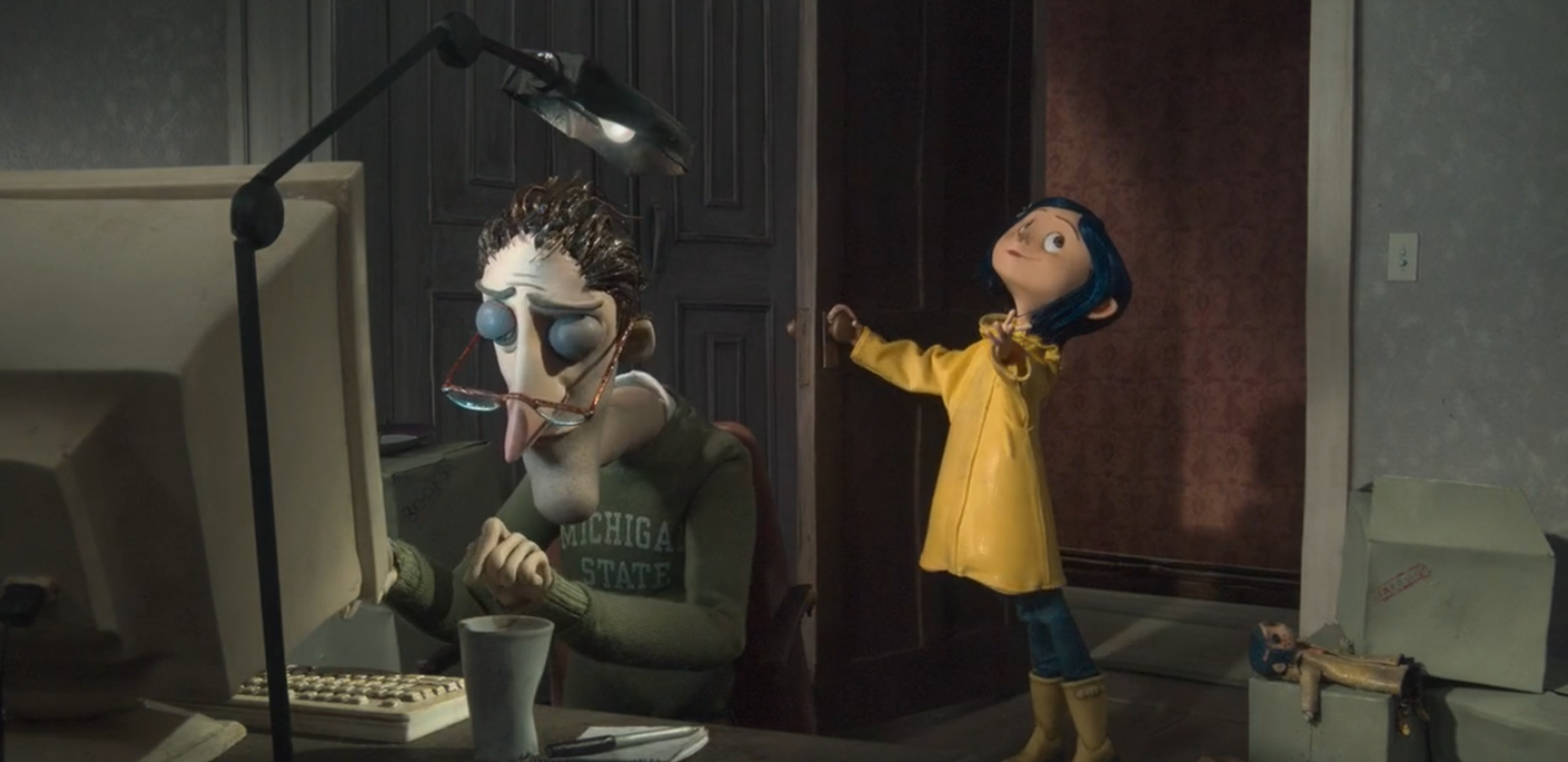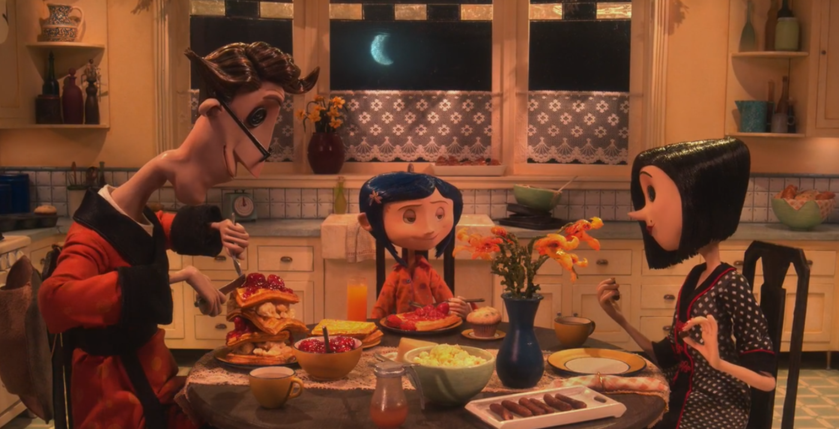 而在魔法世界中的父母,虽然眼睛是纽扣,看起来很诡异,但他们却乐于陪伴她。魔法母亲会做好吃的,魔法父亲会为她弹钢琴、布置花园。
