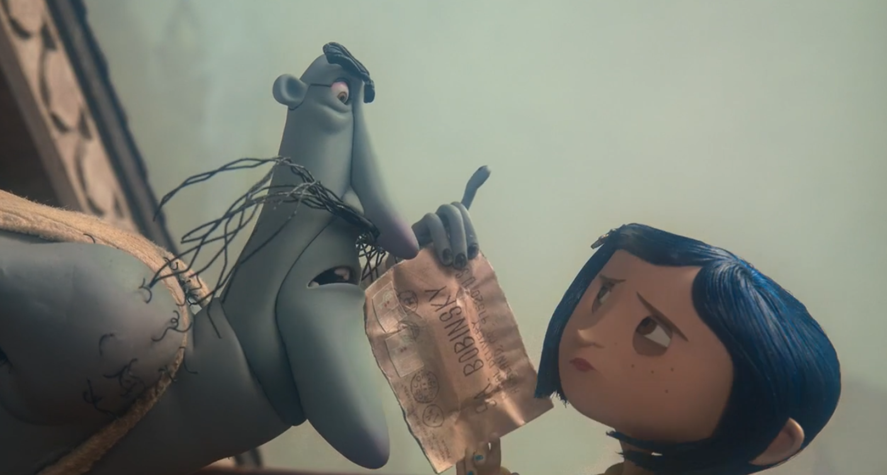 在《鬼妈妈》中,主角少女拜访了两家邻居。一家是过气的马戏团表演家,现实的他是个酒鬼,不修边幅,往日辉煌不再,但他还梦想着重回马戏团表演。于是,在少女的想象中,也即魔法世界中,他灵动的指挥跳鼠,展示了精彩的表演,少女为之鼓掌。