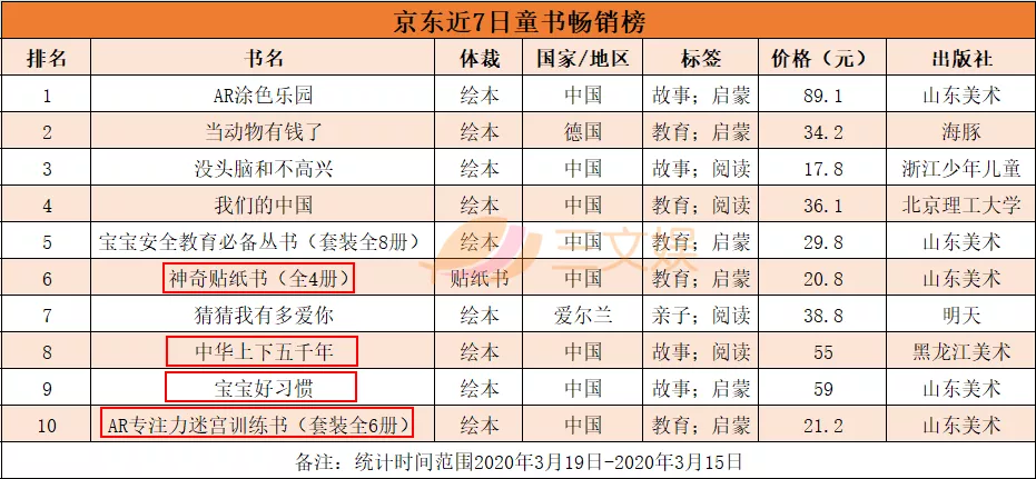 京东图书方面,儿童图书仍以绘本为主,受众多为3-6岁的儿童。题材多是教育、启蒙。其中,来自中国的作品占据了8个席位,与之前的几周统计有所上升。