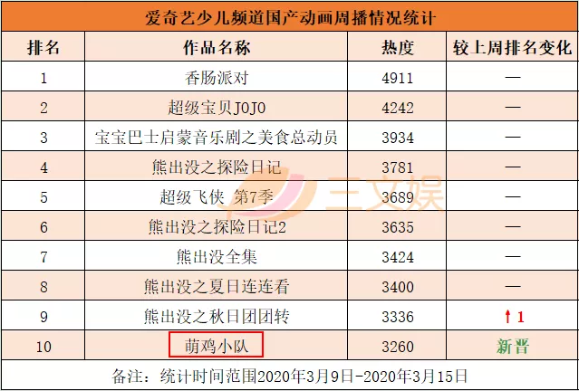 爱奇艺少儿动画榜单排名很稳定,上周有一部新晋榜单作品。