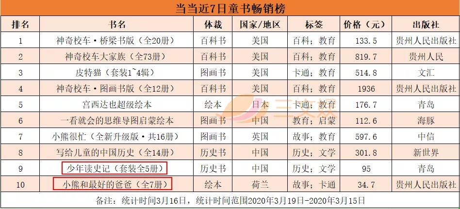 当当童书近七日畅销榜前三名分别为《神奇校车·桥梁书版》、《神奇校车大家族》和《皮特猫》。