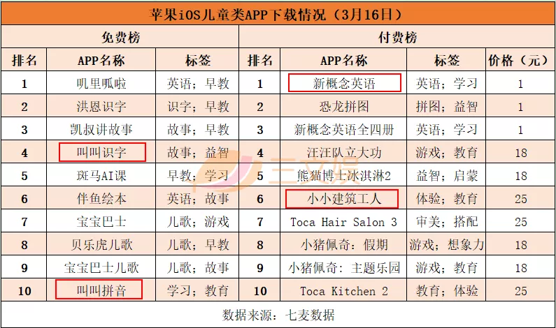 免费榜中,《叽里呱啦》排名第一;《洪恩识字》排名第二;《凯叔讲故事》排名第三。