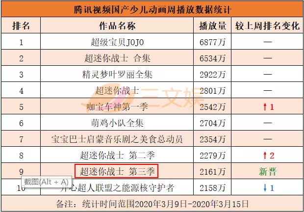 腾讯视频上,国产少儿动画周播前三名分别是《超级宝贝jojo》、《超迷你战士 合集》和《精灵梦叶罗丽全集》。