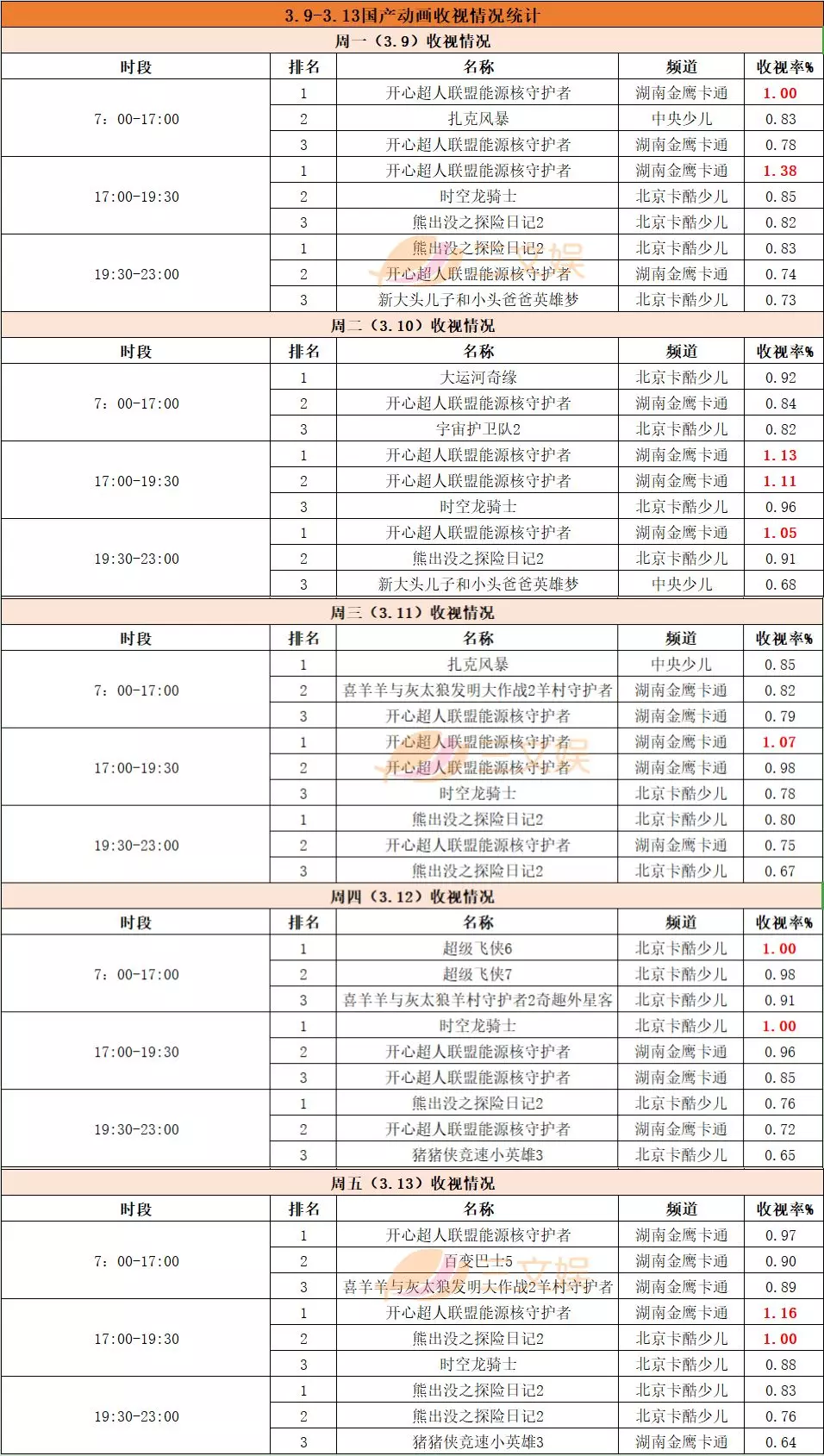 从时段来看,上周在收视率破1的时段分布在各个主要时间段中。而最多的是17:00-19:30。这个数据和上周相比变化较大。收视破1 的少儿动画有《开心超人联盟能源核守护者》《超级飞侠6》《时空龙骑士》和《熊出没之探险日记》。