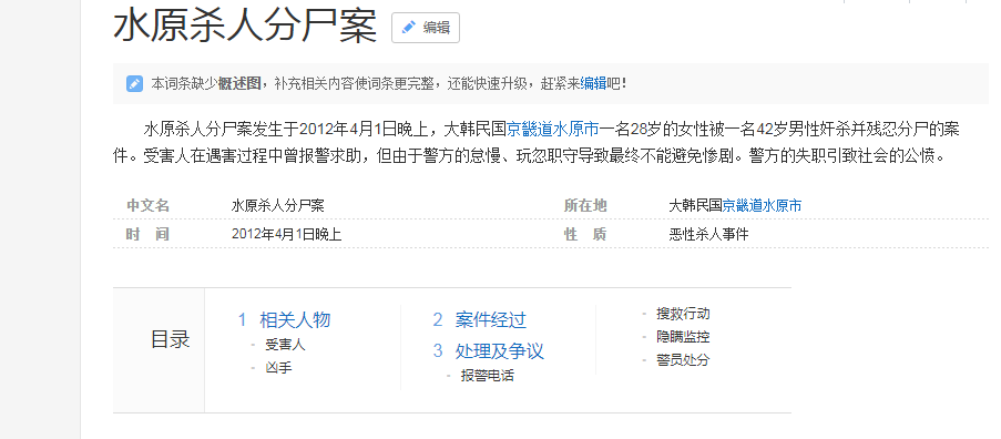 一名住在韩国京畿道水原市的年轻女性在2012年4月1日打电话报警,自己可能会被侵犯,并详细告知了自己的地址。但警方以"经验主义"认为是"夫妻吵架",无视了女子在电话中长达7分钟的痛苦呼喊。13个小时候,警方发现报案女子被侵犯后杀害,并被凶手碎尸。4月9日警方抓获了42岁的凶手。