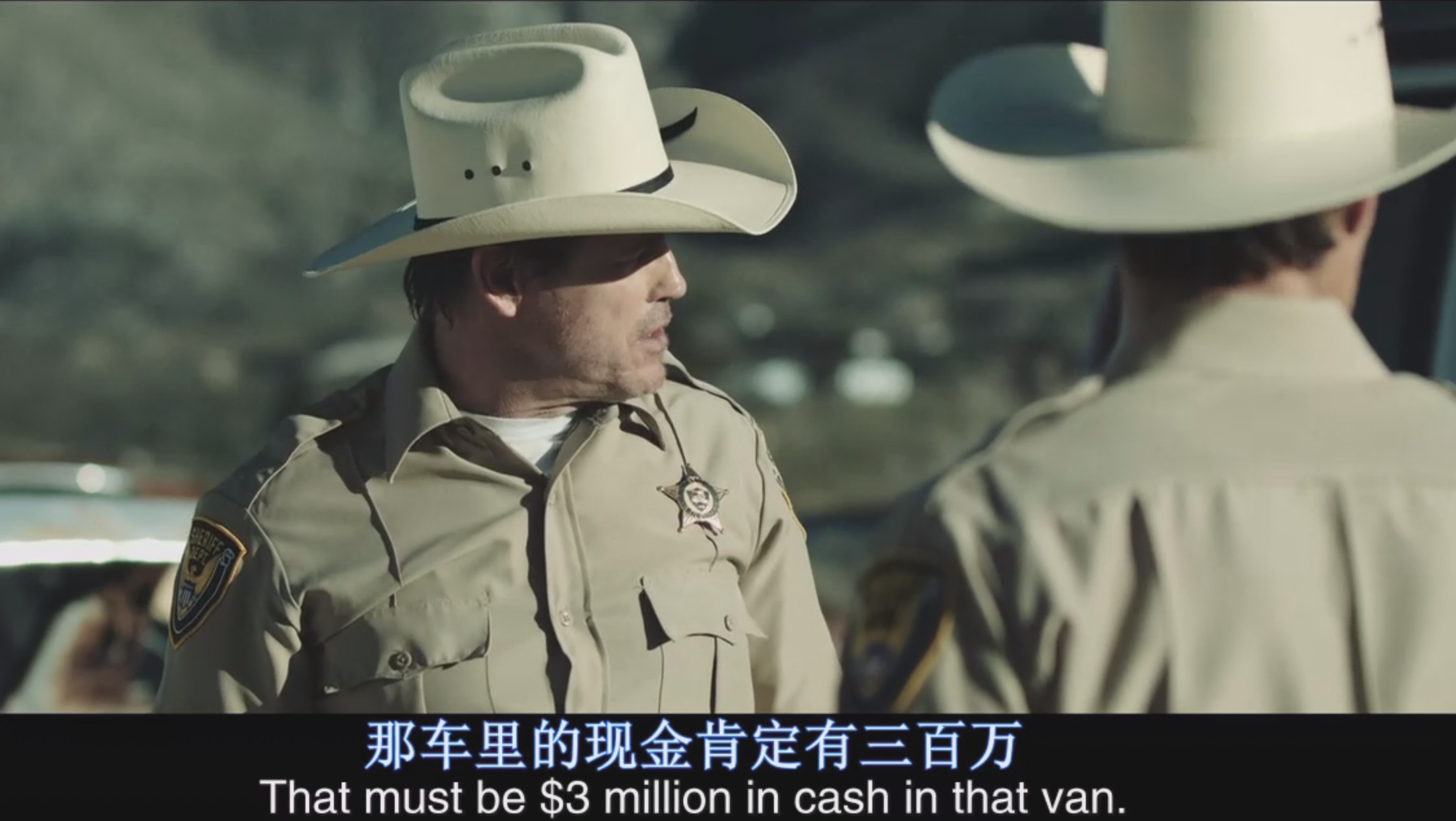 这时警笛响起,来了一辆警车。车上下来一名警长奥尔森和一名年轻探员塞缪尔。奥尔森发现一辆车上有大约三百万美元的现金,他试图说服塞缪尔私吞这笔钱,塞缪尔不为所动,转身想打电话回警局。奥尔森从背后开枪杀死了塞缪尔。