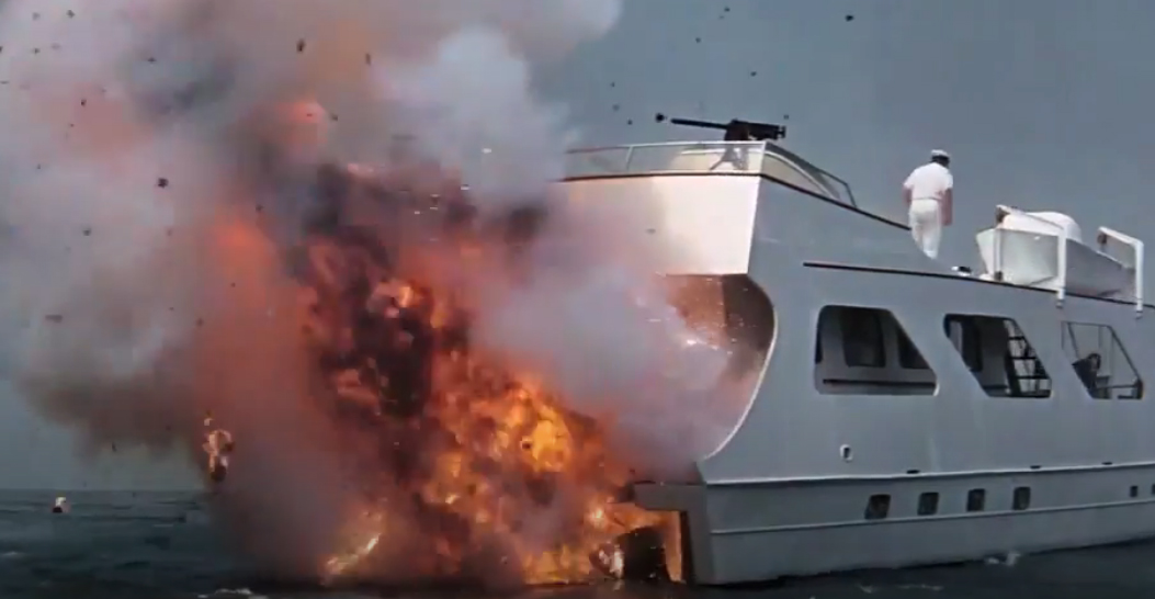 《007之霹雳弹》中的一个场景要求反派的游艇撞上岩石并爆炸。该团队从一名美国空军中尉那里获得了一些实验性火箭燃料来帮助爆炸。爆炸原来如此强大,以至于小船飞出水面,差点落在船员身上。后来,他们发现爆炸震碎了30英里外的窗户。