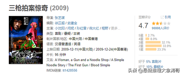 出演张艺谋导演的电影《三枪拍案惊奇》,第一男主,豆瓣评分4.7。