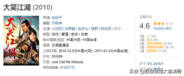 2010年主演动作喜剧电影《大笑江湖》,第一男主,豆瓣评分4.6,小沈阳搭档林熙蕾