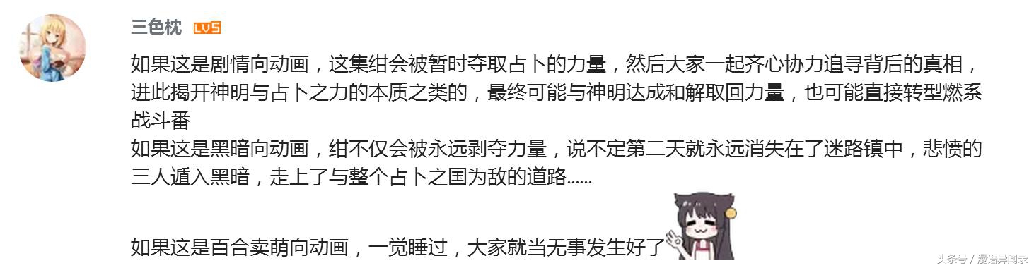 比如b站第二集中,b站用户小拧就在评论里科普了下:关于占卜的禁忌,动画这里少了一段描述:很久以前,神赐予了一名少女一根箭矢,示意少女用箭矢指引道路,少女靠着这跟箭矢帮助无数少女指名了道路,自己的占卜能力也越发精湛,但随着时间的流逝,少女越发想知道神明的真相,于是少女带着这种想法,朝着神的方向射出了箭矢——随即箭矢从背部贯穿了少女的心脏...