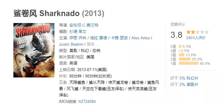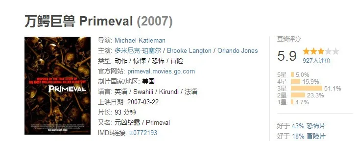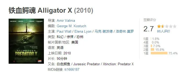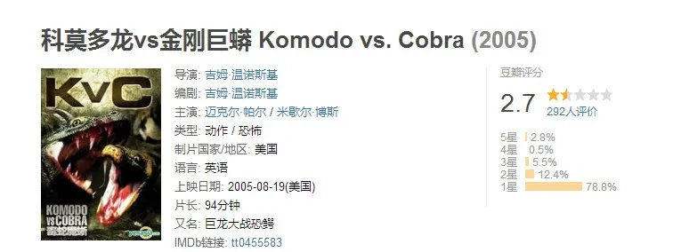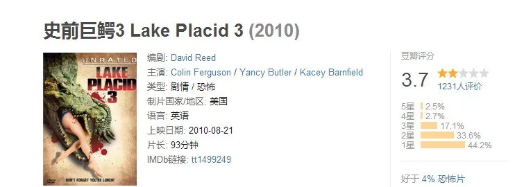 接下来。为大家梳理一些爬行动物的灾难片,首当其冲的就是狂蟒之灾系列,非常经典,但是豆瓣平台一般对灾难性影片打分较低,所以请忽略下分数,不过按照我看过的经验和结合豆瓣的打分,4分以下的灾难片还是可以不用看的,特技或者剧情都是被吐槽的点。爬行动物的灾难片以蟒蛇和鳄鱼为主