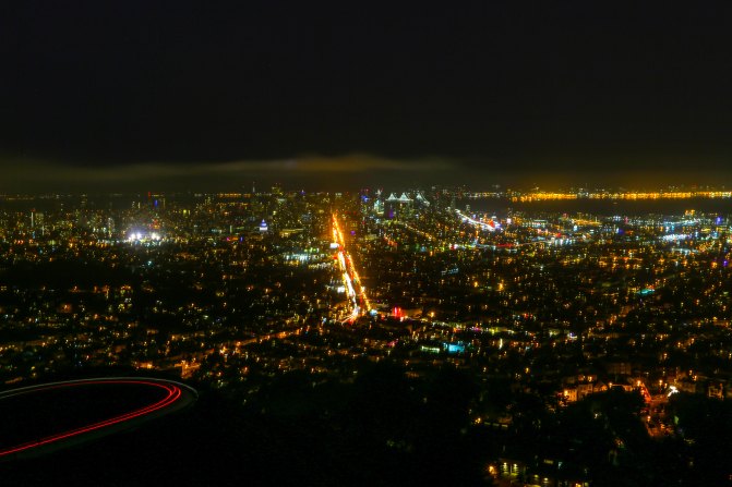 这个城市依然灯火通明,目光所及之处,霓虹灯闪烁,车流不息,远处最高的大厦顶上发出两条蓝光射向远方。