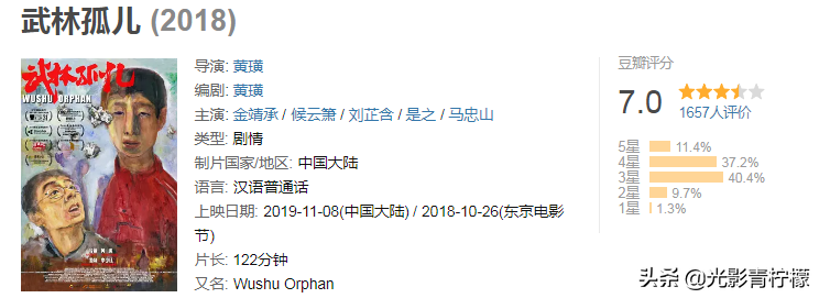 2018年《武林孤儿》在东京电影节大获好评,2019年11月在国内上映,却没有半点水花,看了看豆瓣评分1657人评价,就已经有7.0的成绩了。