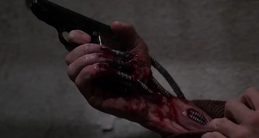 接下来的情节更加扑朔迷离,马克斯的手与一把枪融合,其女友又好像被吸进了电视机里,成为了二维的影像,videodrome的掌管人是一家镜片店的老板,他发明出了一种阴极射线管让马克斯去体验……