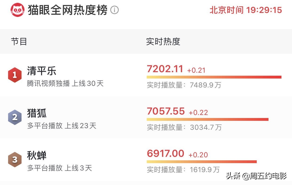 5.4青年节之际,欢瑞世纪出品,旗下艺人任嘉伦、李曼领衔主演的谍战剧《秋蝉》开播,首播日便取得了猫眼电视剧热度榜第四位的成绩,截至今日该剧荣升至榜单第三位。