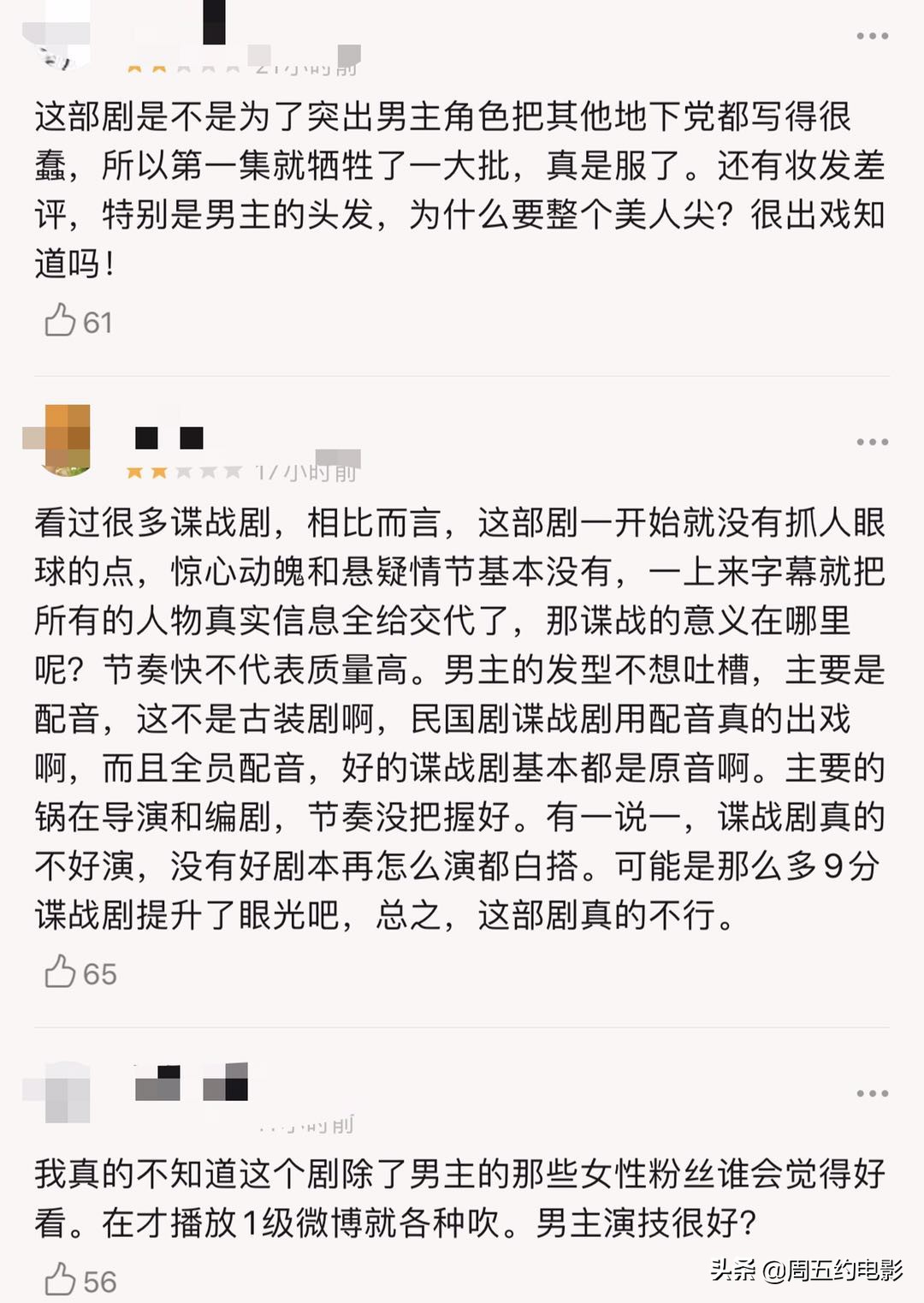 有一说一,每个观众的审美标准都决定了各自对电视剧不同的见解,从已播出的几集来看《秋蝉》相较于早年播出的其他谍战剧来说没有达到让人眼前一亮的感觉。