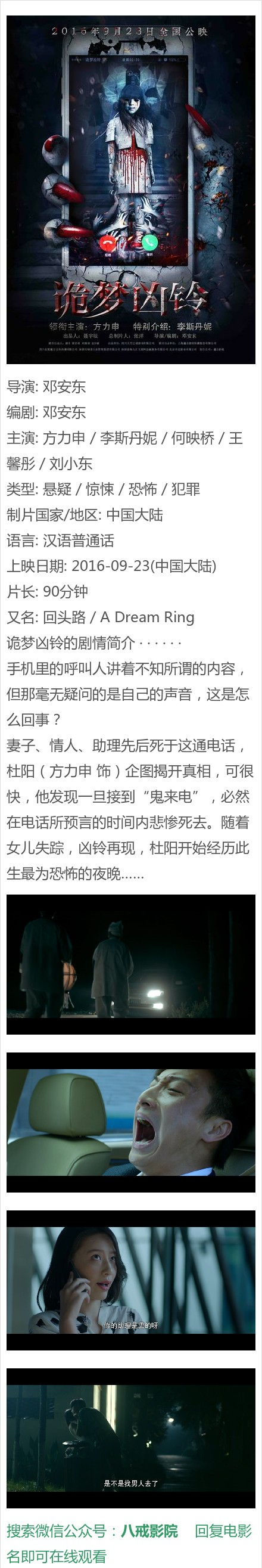 诡梦凶铃是由方力申,李斯丹妮,何映桥,王馨彤,刘小东主演的一部科幻片。"
