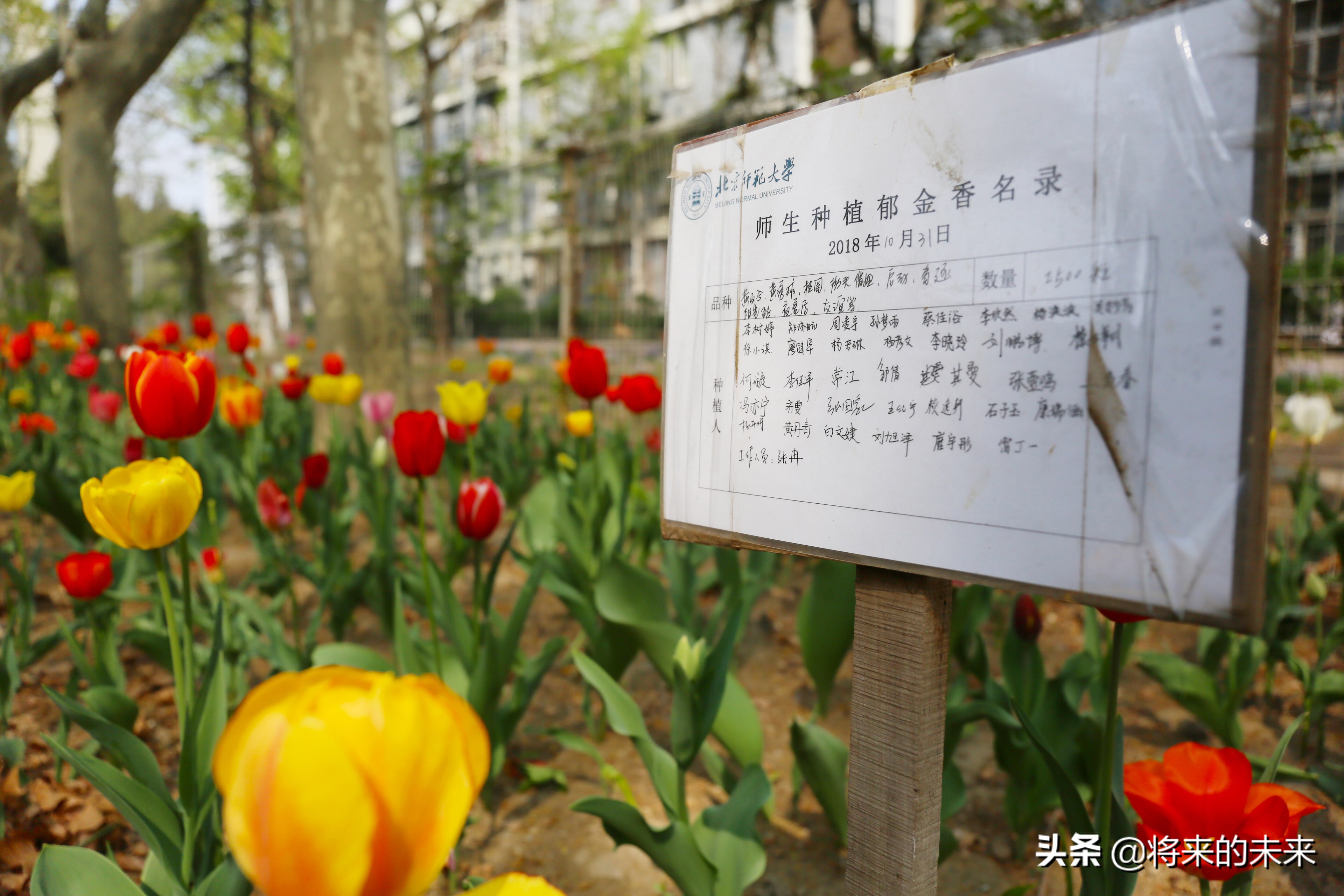 北师大师生共同培育的郁金香,去年栽培分别种在道路两侧和空余地段,每年4月份五彩的花朵很充满整个校园使得变成“花园校园”。