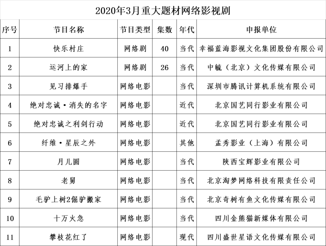 今年2月,国家广电总局首设重大题材网络影视剧项目库,分为网络剧、网络电影、网络纪录片三大类。
