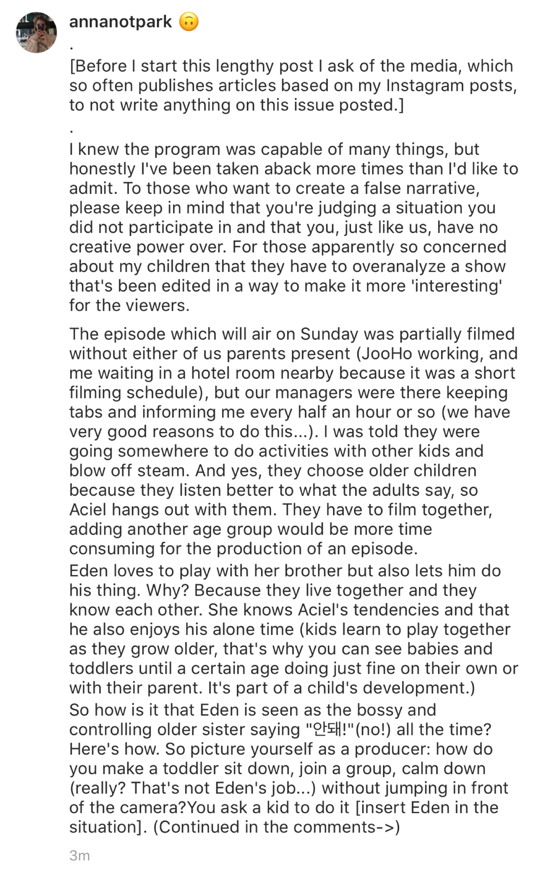 于是妈妈安娜就此事询问了节目组,并且还把这事在ins公开讨论过,引起粉丝们探讨。