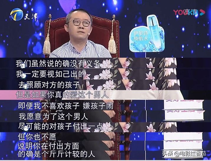 (对女方):我们虽然说的确没有义务,我一定要视如己出去照顾对方的孩子;但是如果你真的爱这个男人,即便我不喜欢孩子嫌孩子闹,我愿意为了这个男人尽可能对孩子付出一点。但你也不愿意,说明你在付出方面,的确是个斤斤计较的人。