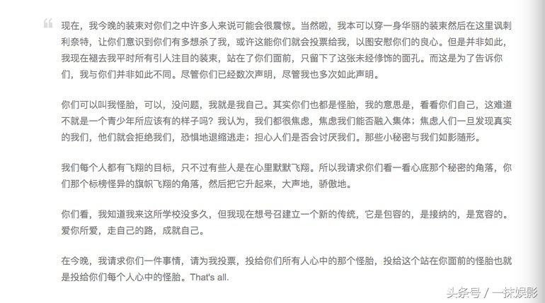 最后,比利的出场赢得了全校的欢呼,演讲的都是肺腑之言,戳到了大部分人的内心之痛,直言自己是怪胎,但每个人心中何尝不是都住着一个属于自己的怪胎呢,虽然最后没有得到冠军,但是赢得了人心,同学们都接受了他,和关系不好的老爸,也成功和解。