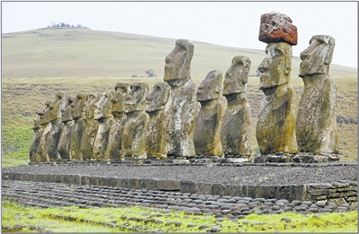 在海边一处石台,我们看到壮观的一幕:15个巨大的摩艾并肩而立,背对大海,眺望远山,其中一个还戴着用红色巨石雕刻的圆柱形“帽子”。据说,这是权力的象征。从导游图上看,还有一处景点,3尊摩艾站在一起,都戴着“红帽子”。可惜,由于头一天飞机晚点,原本两个半天的游览被压缩成半天,只好抱憾放弃了那个景点。